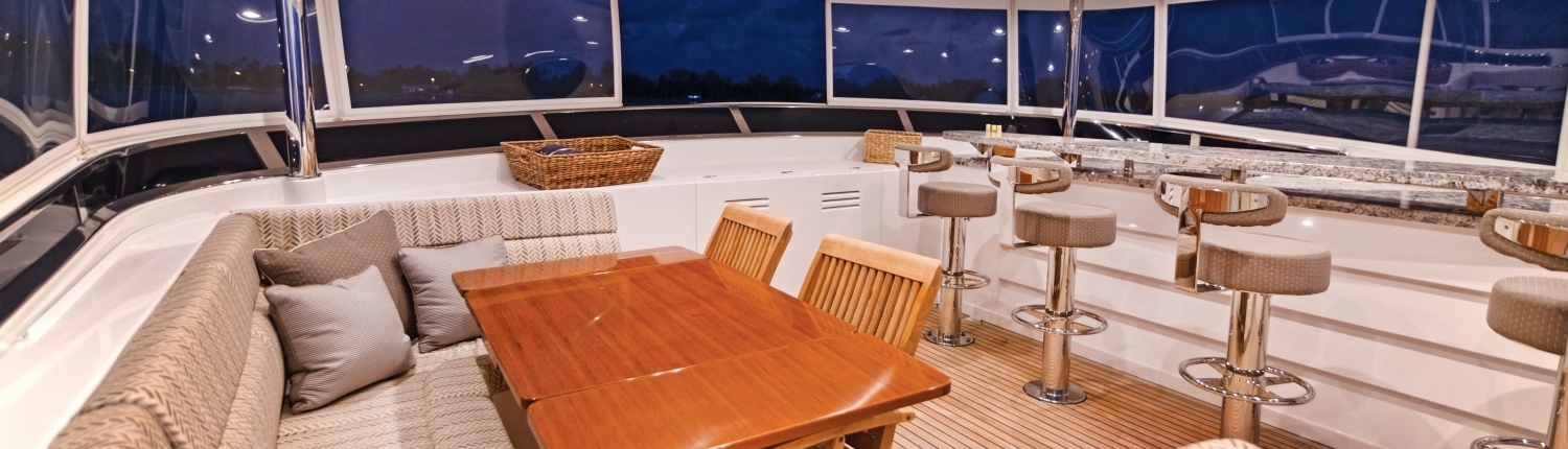 Sunbathers have choice options for relaxation on the flybridge, with the aft section offering a double-sized sunpad and a Jacuzzi forward. For a break from the sunshine, the enclosed forward section beneath the hardtop is fitted with a starboard bar and a port alfresco dining area with an extendable table and a C-shaped sofa.