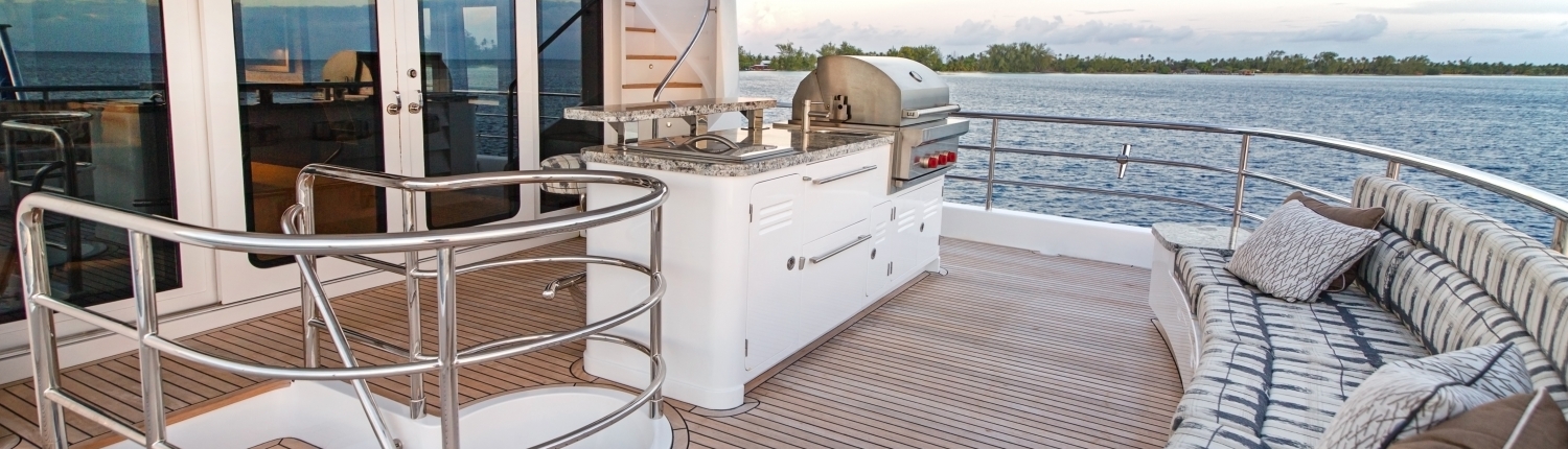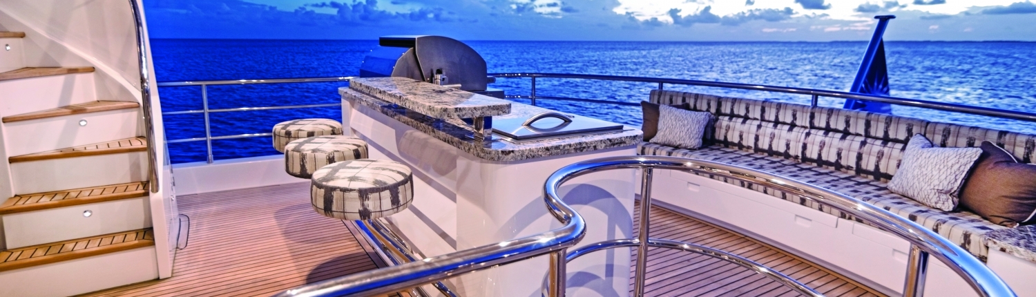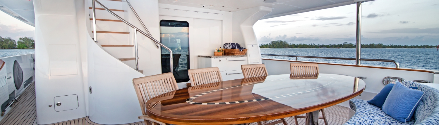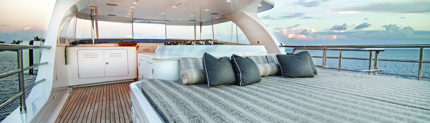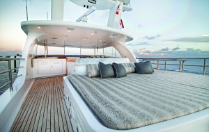 The swim platform provides an easy way in and out of the water with quick access to the main deck aft, where guests can dine alfresco at the aft sofa and raised table. Alternatively, there is a port staircase connecting to the upper deck the group can rest on the stern settee and take in the views or get refreshments from the bar. An additional seat is placed in front of the helm station for a more tranquil location to take in the forward views.