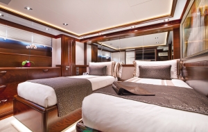On the lower deck, the accommodation provides guests with one double cabin and two twin cabins convertible to Kings, all with en-suite facilities. A forward glass staircase connects the levels and adds to the ambiance of the main deck formal dining area, which places a sizeable bar to the port side and a grand table to seat eight guests beneath a bespoke chandelier. Farther aft is the salon, which creates a symmetrical setting with matching L-shaped sofas under both windows as well as two coffee tables and armchairs. The Master suite is positioned forward on the main deck and benefits from large windows for plenty of natural light and a spacious bathroom.