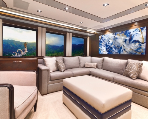 The decor is an update on the timeless and elegant superyacht interior, providing deep wood panelling and bright white furnishings with accents in silver and blue. Mirrors on the ceiling enhance the lighting and vibrant modern artwork with marbling effects stands out against the otherwise neutral tones.